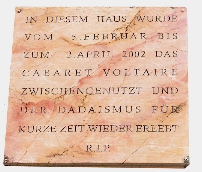 Cette action est aujourd'hui évoquée par une autre plaque au-dessus de l'actuelle entrée principale, située sur la Münstergasse : «Dans cette maison, du 5 février au 2 avril 2002, le Cabaret Voltaire a été utilisé temporairement et le dadaïsme a été brièvement ravivé R.I.P.» Le ton nostalgique peut être lu de différentes manières : Avec la mention "brièvement", on veut peut-être suggérer que Dada ne peut pas être institutionnalisé et qu'il ne peut fonctionner que comme utilisation intermédiaire. En même temps, la plaque a une intention commémorative : l'occupation est à l'origine de l'existence actuelle du Cabaret Voltaire en tant qu'institution culturelle zurichoise.