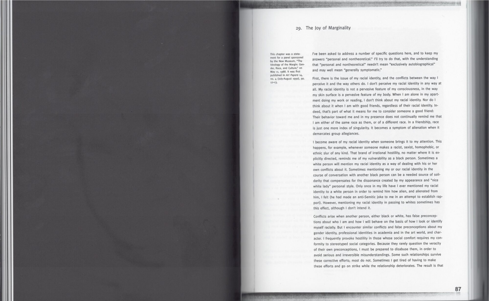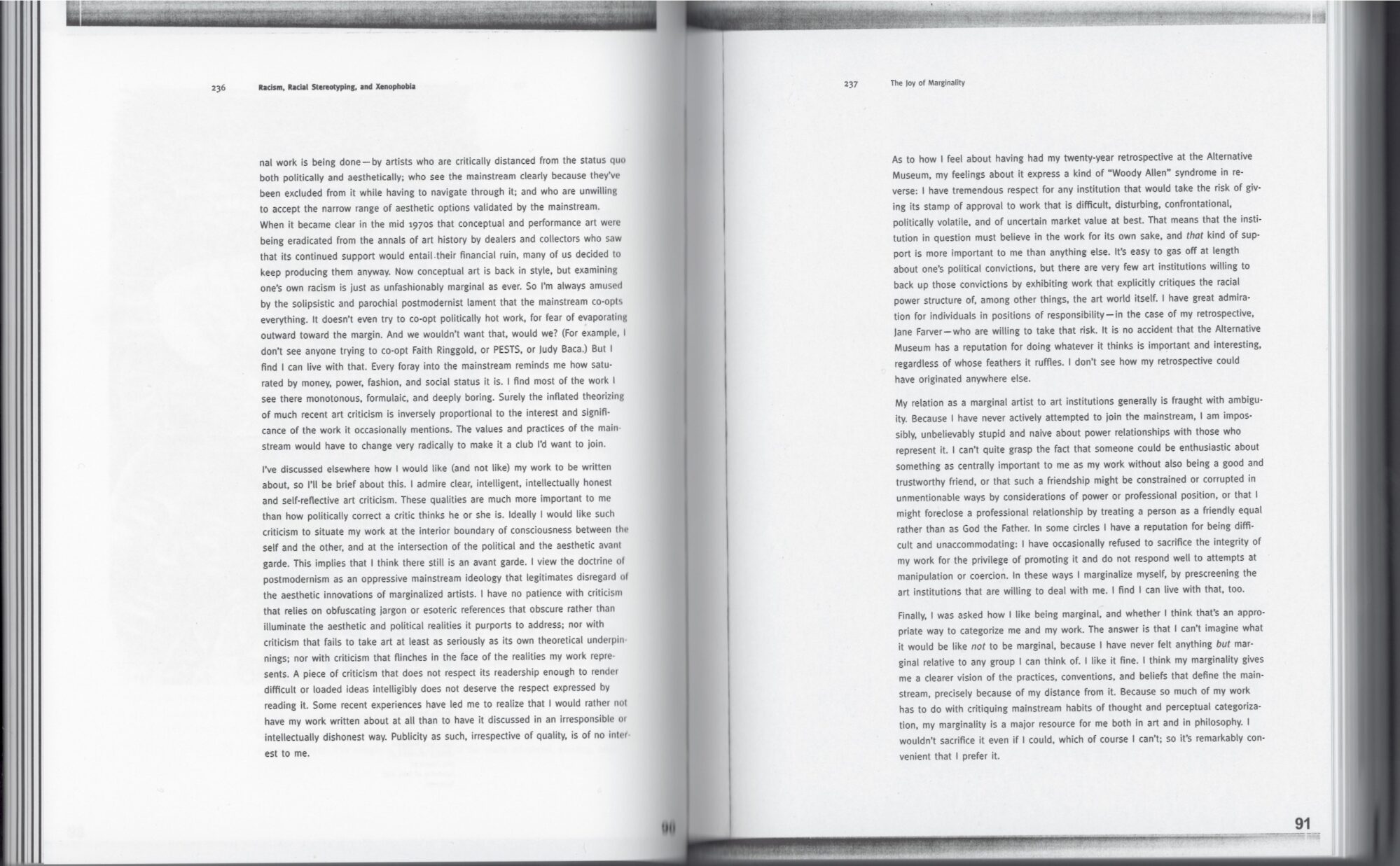 Im letzten Blogeintrag ging es um Black Dada Flag (Black Lives Matter), weisse Solidarität und ein gekapertes Hashtag. Heute ist Adam Pendletons Black Dada Reader in der Dada-Bibliothek angekommen. In Anlehnung an Dada versteht er Black Dada als künstlerische Möglichkeit, über die Zukunft und gleichzeitig über die Vergangenheit zu sprechen. Dabei bringt der afroamerikanische Künstler Stimmen auf eine Art und Weise zusammen, welche die einfache Logik und die etablierte Geschichte stören. So steht Hugo Balls Dada Manifesto dem Black-Power-Text von Stokely Carmichael The Pitfalls of Liberalism gegenüber. Solche Überblendungen interessieren Pendleton. Denn sowohl Dada als auch Black Power weisen feste Bedeutungskategorien zurück und eröffnen neue Denk- und Handlungsmöglichkeiten. Zu Pendletons Text-Kollektion gehört auch Adrian Pipers The Joy of Marginality (unten in der Slideshow). Die Künstlerin schreibt 1988, sie sei auch froh über die Marginalisierung, da sie aus dieser Perspektive die Aggressoren ausmachen könne. Ihre Kunst soll Akt der politischen Kommunikation sein, die Betrachter*innen kanalisiert, über ihre eigenen tiefen Impulse und Anworten auf Rassismus und Xenophobie nachzudenken. In diesem Sinne kreiert Piper einen Trainingsgrund für Wahrnehmungs- und Denkspiele, die aber durch die sorgfältige Gegenüberstellung von Bild und Sprache zur Reflexion von konkreten politischen Ereignissen wie Rassismus führen sollen.