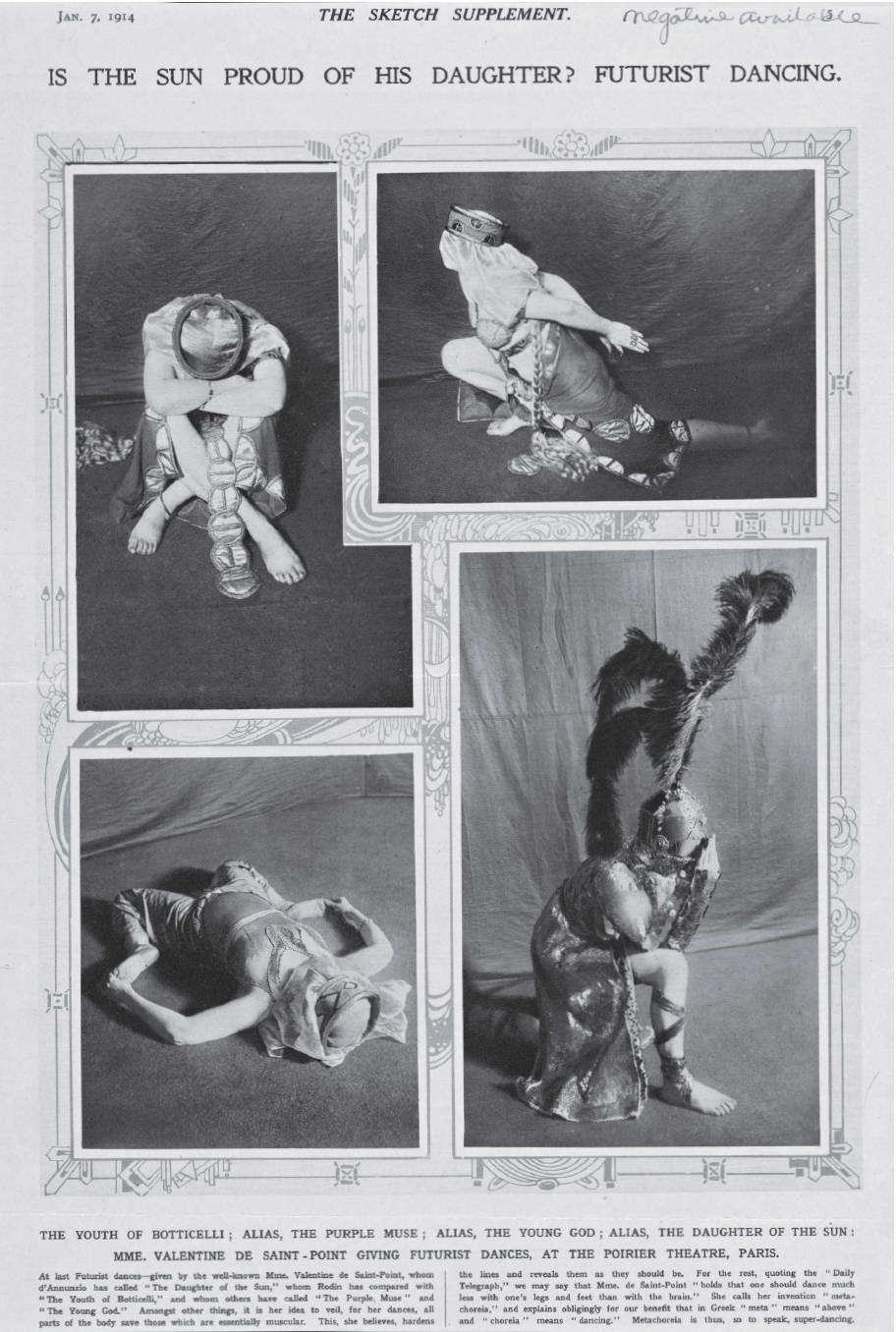 “Mme. Valentine de Saint-Point giving futurist dances at the Poirier Theatre, Paris,” (The Sketch Supplement, January 7, 1914, Image courtesy of the Jerome Robbins Dance Division, The New York Public Library for the Performing Arts)