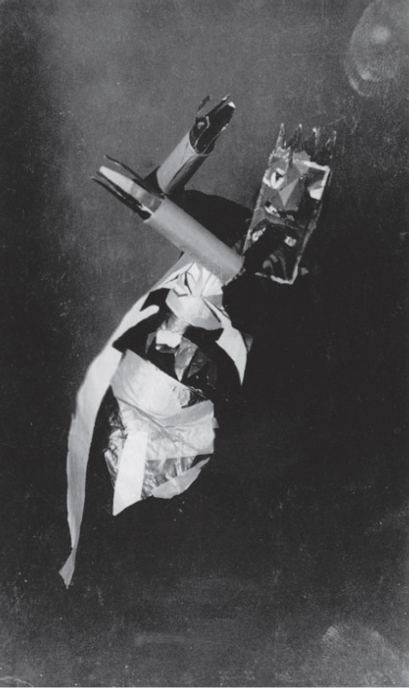 On the photo, we observe Taeuber wearing a long, straight, white dress and a frightening rectangular mask with a giant open mouth and dangerous-looking half open eyes (Doutreligne and Stalpaert 533). The mask (either made by Jean Arp or Marcel Janco), decorated in a Cubist fashion, ended in four sharp edges at the top, resembling the abstract idea of hair or alternatively a crown. The sharp edges, as well as her mechanical fingers along with parts of her dress, reflect the bundle of light that was directed at the upper body, leaving her legs and feet invisible and in the dark. Furthermore, the cardboard tubes that enclosed her arms resembled the ones that Ball wore during his performances as the Magic Bishop. They were so tight that it was impossible for her to bend her arms. Her dress was decorated with geometrical symbols and loose, hanging, shiny ribbons. Her body leaned to the back dramatically while her hands were crossed and raised, as if to protect her mask from the light bundle directed towards her. This picture gives us a unique insight into the theatrical language of Dada through mask and costume, yet however informative this picture is, it is important to keep in mind that it was not taken during, but rather before or after, the performance. As such, it functioned as a performance in its own right: a theatrical composition outlined in time and space, captured in one static picture.