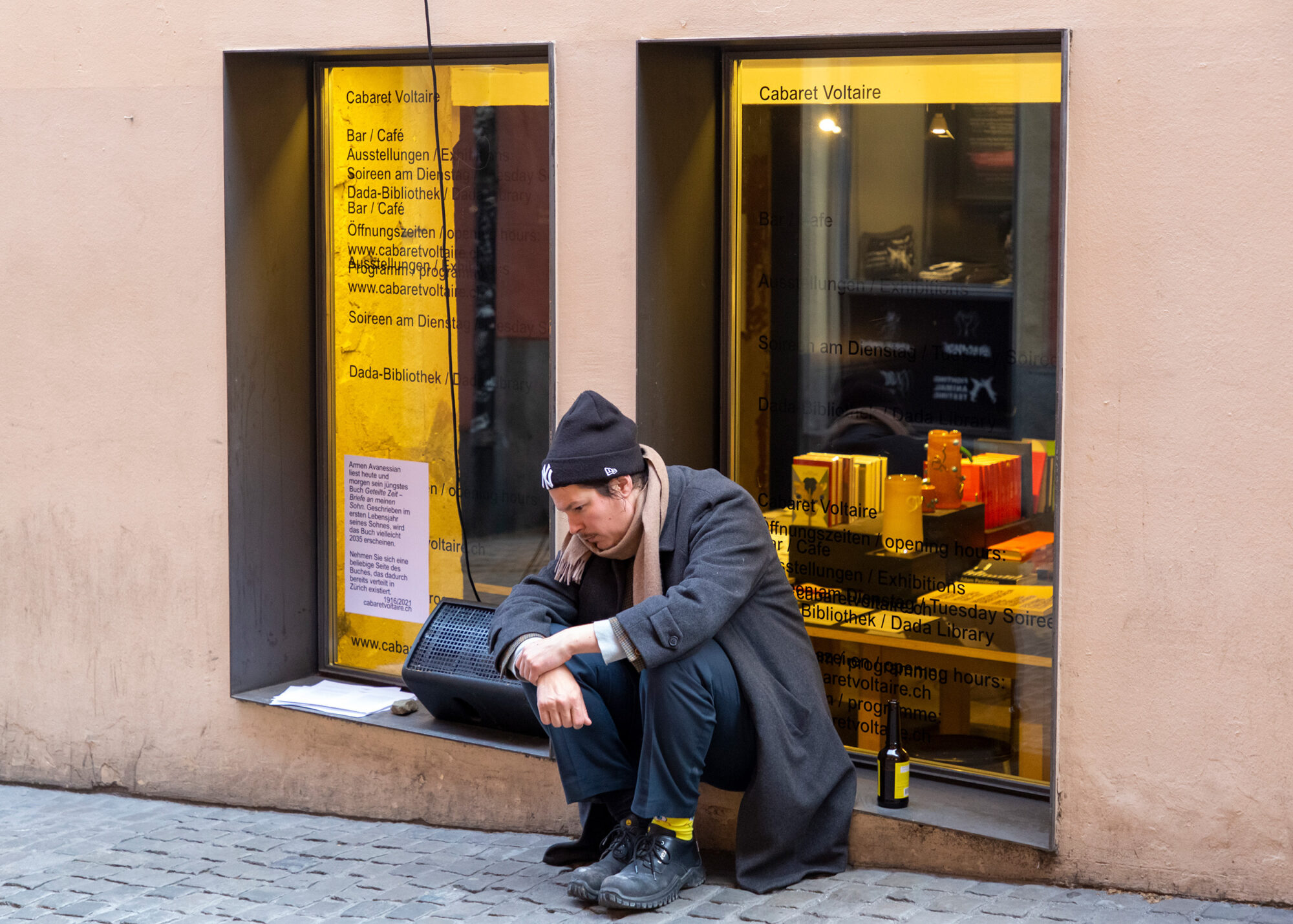 Es ist schwierig, die Sonderjahre 2020, 2021 und (wahrscheinlich) 2022 voneinander abzugrenzen. Die wellenartige Realität der Pandemie überschwemmt Orientierungspunkte, und trotzdem bleiben gewisse Ereignisse in Erinnerung: Der Sturm aufs Kapitol, die erste Impfung, das Unwetter im Sommer. Vielleicht sind es die limitierten physischen Begegnungen, die fehlende Spontanität oder die latente Angespanntheit, die das Gefühl eines dahindümpelnden Alltags auslösen. Im Cabaret Voltaire stieß dieses Gefühl einer ausgedehnten Ausnahmesituation auf eine weitere Ausnahmesituation, die den pandemischen Rhythmus retrospektiv wohltuend störte. Im Mai 2021 begann die Sanierung der historischen Räumlichkeiten an der Spiegelgasse 1, die voraussichtlich im März 2022 abgeschlossen werden. Während der Instandsetzung besuchte das Cabaret Voltaire Orte, die schon für die Dadaist*innen 1916/1917 von Bedeutung waren. Von Mitte August bis Oktober präsentierten wir ein Projekt auf dem Monte Verità, der zentral für die Lebensreform war und auf dem sich auch viele Dadaist*innen tummelten. Ende August bis Anfang September bespielte das Cabaret Voltaire den Züricher Münsterhof in unmittelbarer Nähe zum Zunfthaus zur Waag. Dort fand 1916 die erste Dada-Soiree nach dem Ende des historischen Cabaret Voltaire statt. Das Jahr 2021 startete jedoch – nach einer zweimonatigen Schließung aufgrund von Covid-19 – im März an der Spiegelgasse. Der Gastronomielockdown und das Veranstaltungsverbot hatten zur Folge, dass wir den Historischen Saal zum Ausstellungsraum umfunktionierten. So war es uns möglich, gerade jungen Künstler*innen erste institutionelle Ausstellungserfahrungen zu ermöglichen. Online-Kooperationen mit dem Berner Radio Bollwerk, dem Online-Magazin Republik, der Volksbühne Berlin und dem Theater Neumarkt führten gleichzeitig dazu, dass wir unseren Radius vergrößern konnten. Und auch die 2021 initiierten Publikationen gehen aus Zusammenarbeiten hervor: Mit dem Swiss Institute in New York begannen die Arbeiten an der Publikation Emmy Hennings / Sitara Abuzar Ghaznawi, und gemeinsam mit dem Kunsthaus Zürich entstand der Pocket Guide Dada Stadt Zürich. Seit Oktober 2021 ist er in Deutsch oder Englisch erhältlich.