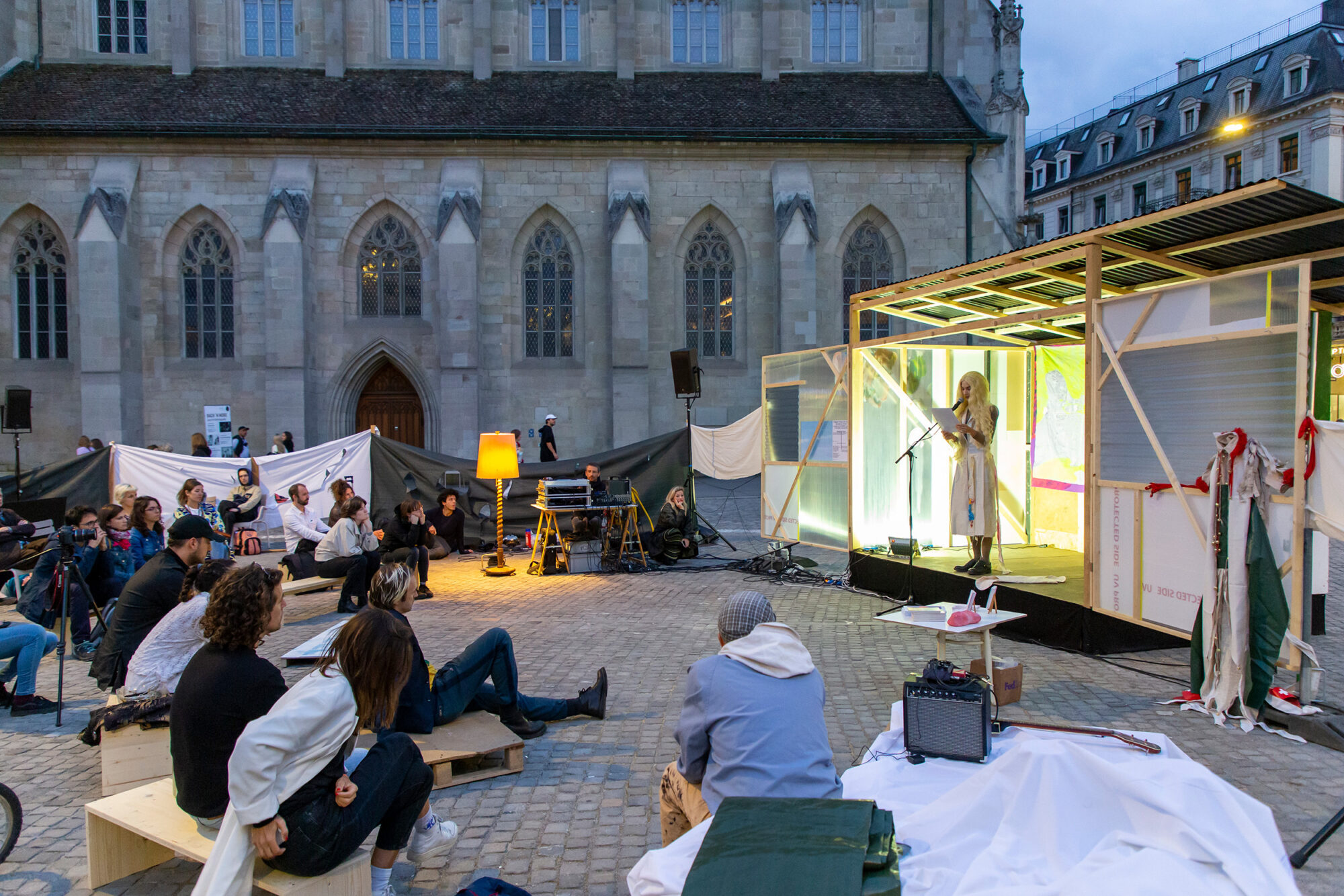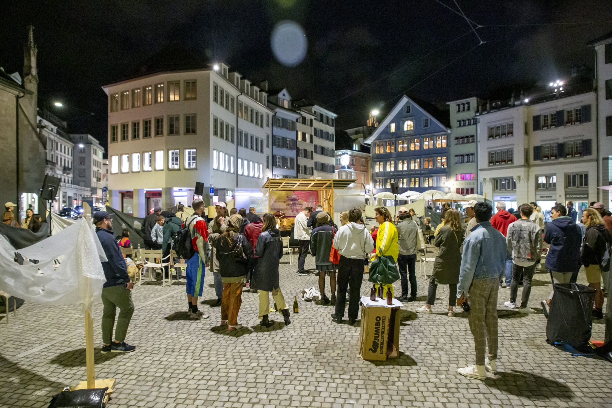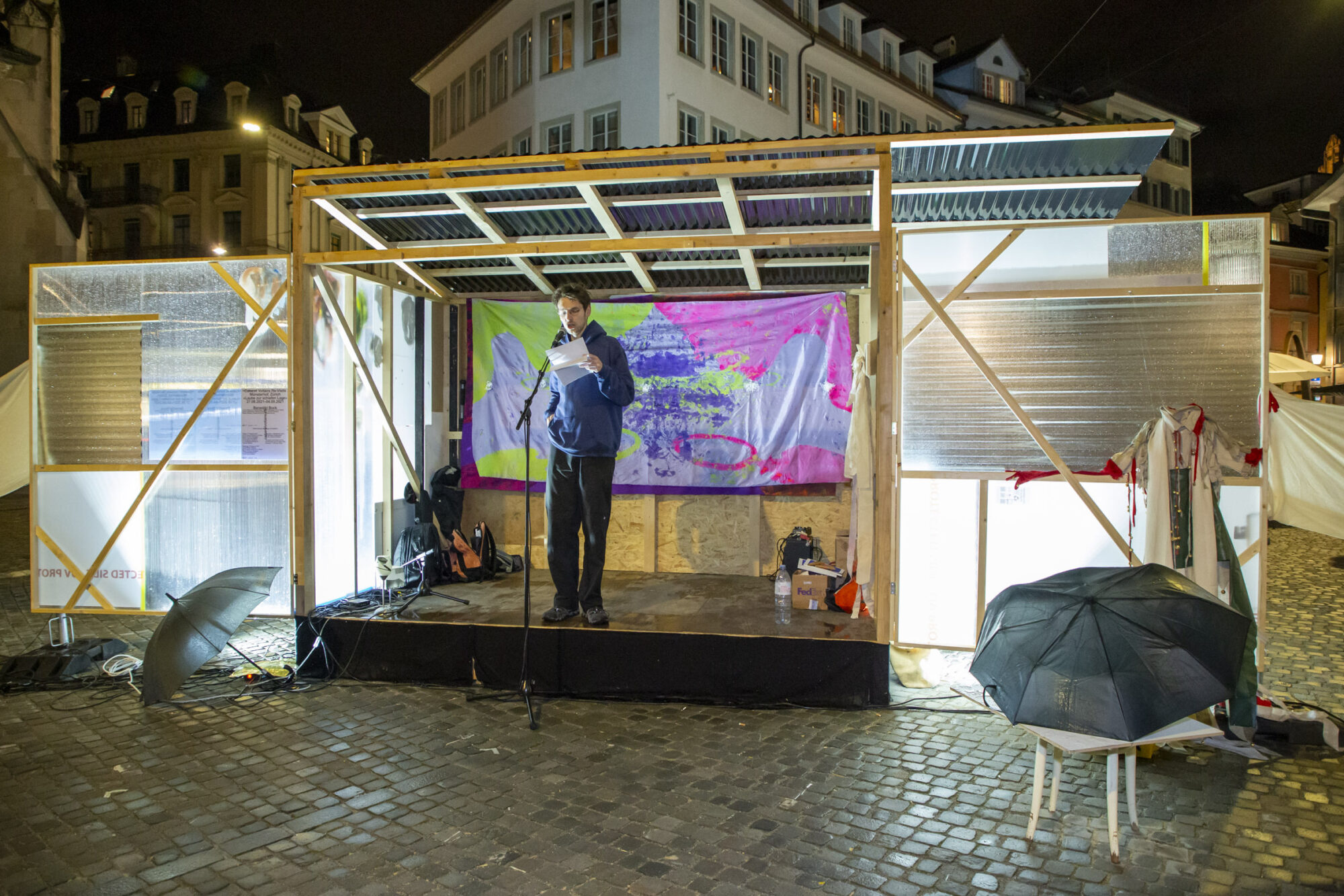 Im Zunfthaus zur Waag erläuterten die Dadaist*innen ihre Zeichnungen, trugen Manifeste vor oder tanzten in Masken. Über 100 Jahre später bespielte das Cabaret Voltaire das Zunfthaus aus naher Distanz mit einer eigenen Bühne. Für den Zeitraum von knapp zwei Wochen wurde die »Laube zur schiefen Lage« zu einem öffentlichen Ort im Spannungsfeld von antibürgerlichen Gesten und bürgerlicher Kultur, Weltbezug und Weltflucht, Gemeinschaftlichkeit und Individualität, dem Kleinen und dem Großen.