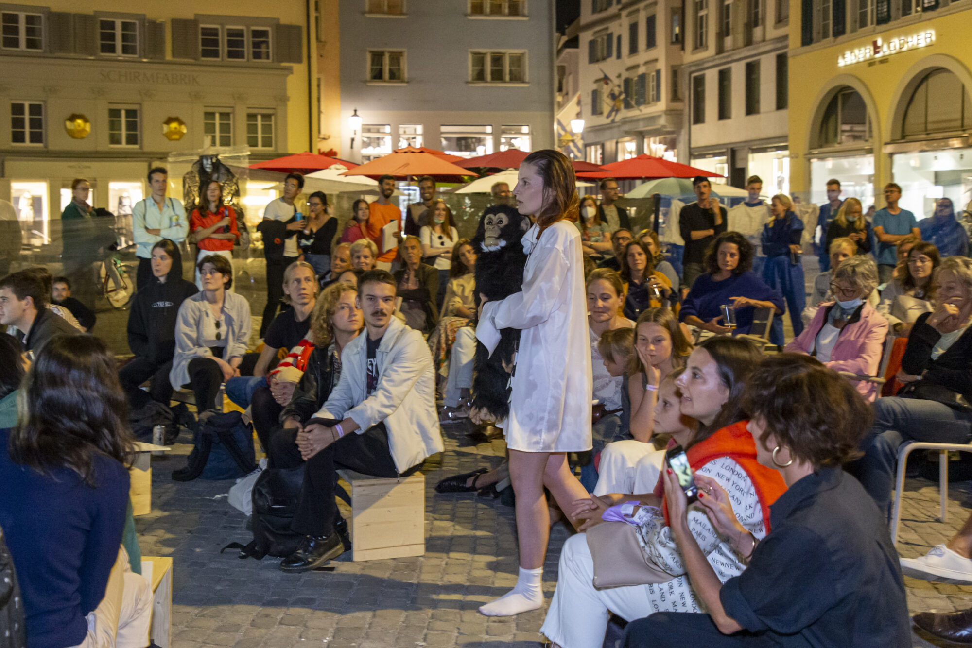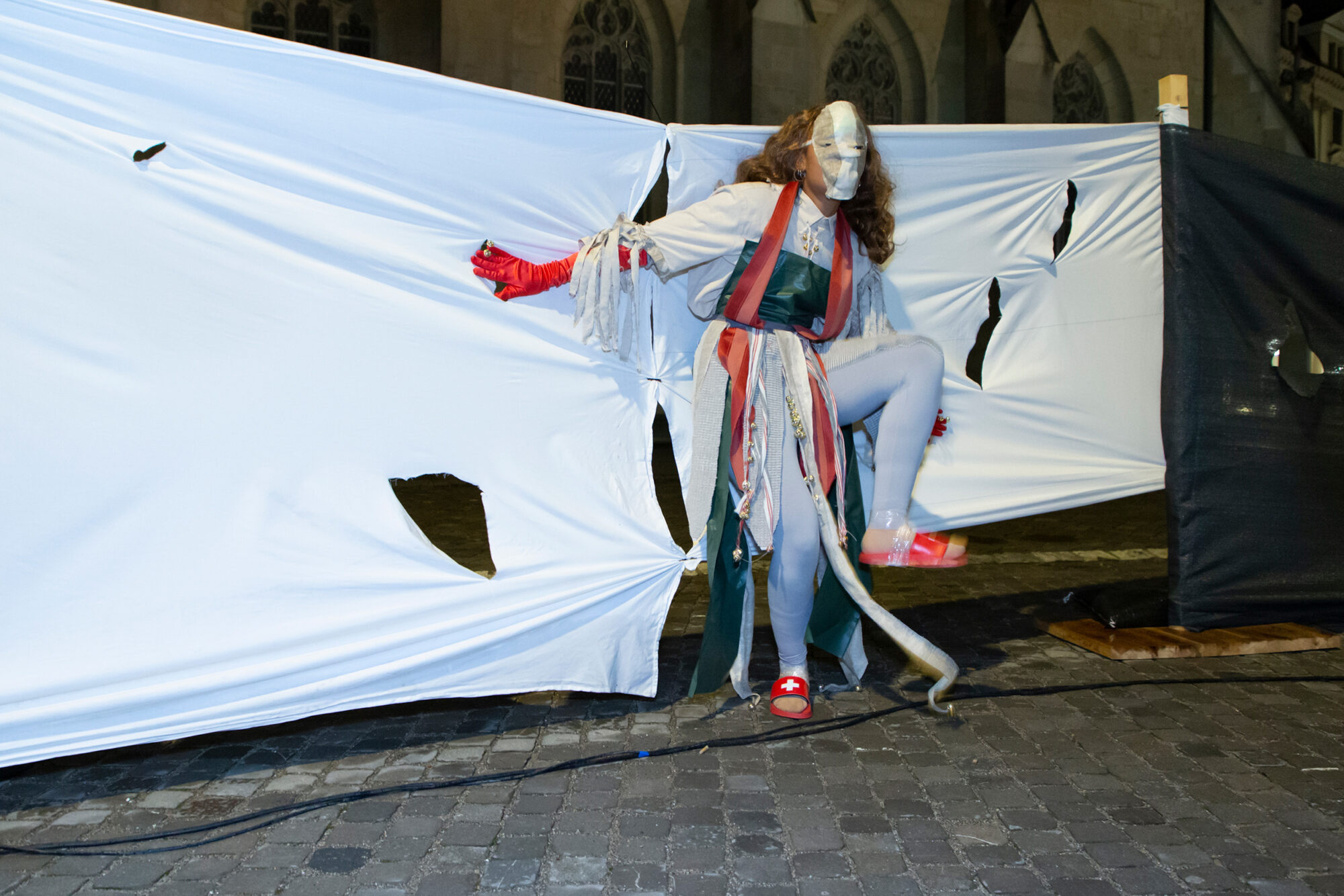 In der Arbeit untersuchten die Künstler*innen mithilfe der Performer*innen Hilma Bäckström, Charlotta Öberg, Luca Büchler, Jessica Comis und Alexandra Paya Themen wie Unsichtbarkeit, inklusive Unterhaltung und exklusive Teilhabe. Die Kostüme, wovon eines in der Laube hängt, sind so gestaltet, dass sie den Raum widerspiegeln, zu dem sie Bezug nehmen – in diesem Fall das Cabaret Voltaire und den Münsterhof. Die Züricher Künstlerin Johanna Kotlaris zeigteAware-Wolf. In der Performance untersuchte sie als tragisch-komische Närrin, wie wir uns in der Begegnung mit der Welt, mit uns selbst und anderen definieren.