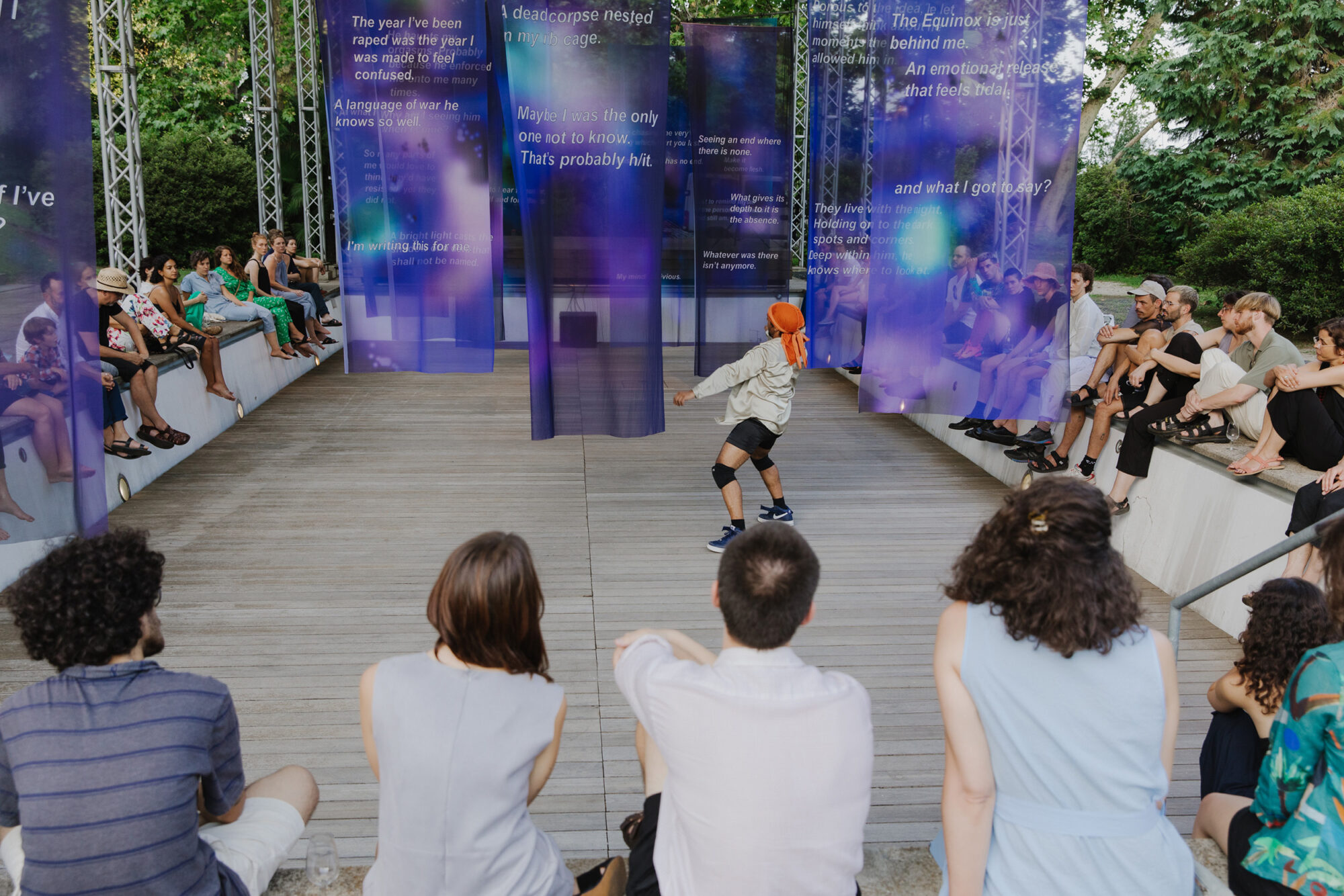 Paul Mahekes künstlerisches Interesse gilt dem sozialen Konstrukt der Körperlichkeit, dem Unsichtbaren und den Kräften, die unsere Körper und Identitäten beeinflussen und informieren. Wie bei den Avantgardist*innen funktioniert der Körper nicht mehr nur als Instrument der ästhetischen Repräsentation, sondern verwandelt sich in eine Quelle der Erfahrung und Befreiung. Kunst wird zur Katharsis an einem Ort, der für Gegennarrative und kollektive Auseinandersetzungen offen war. Der Künstler zeigte im Poolbereich, dem Spazio Piscina, eine Installation aus mit Textfragmenten bedruckten Stoffbahnen, in der er am Eröffnungsabend auch performte. Die Solo-Performance Taboo Durag (2021) näherte sich dem Thema des persönlichen Traumas und der Heilung, der porösen Schnittstelle zwischen Verletzlichkeit und Widerstandsfähigkeit. Für die Performance trug Maheke einen Durag, ein Kopftuch afrikanischer Herkunft, das seit den 1970er-Jahren Teil der afroamerikanischen Jugendkultur ist und von der weißen Mainstream-Kultur in einen rassistischen Signifikanten verwandelt wurde, der mit Gang-Kultur und Gefangenen assoziiert wird. Maheke versuchte so, die in die Kleidung eingeschriebenen Zeichensysteme zu demontieren – eine Auseinandersetzung, die sich auch auf die Reformkleidung um 1900 übertragen lässt.